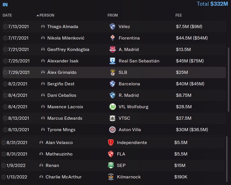 8. Ceballos: cheap! Starts on the transfer list and if you wait a month or two he'll drop down a lot. Still don't know if I recommend. Had a few good games, but was middling most of the time, eventually replaced by Almada. Planning to sell him for easy profit this off season.