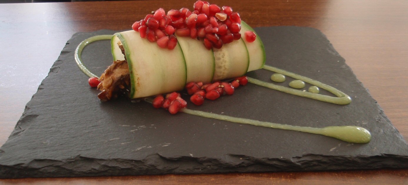BBQ Pork, cucumber cannelloni and Pomegranate salsaWe both had different choices which allowed me to photograph some of the meals. I really enjoyed this way of dining - not quite tapas-size but small portions from a varied menu. It also left room for dessert: pear and ginger crumble for me (healthy with just a smattering of crumble and loads of fruit and ginger!) and mini pavlova with lime curd and fresh fruit for Catriona.