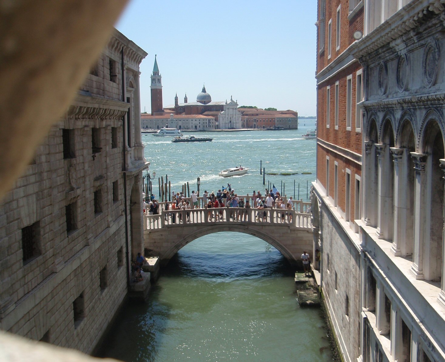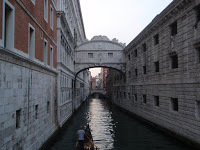Our walk ended at San Marco and we were delighted to discover the company had arranged for us to have a visit inside the Doge's Palace and a walk through the Bridge of Sighs - without joining the massive queue already forming. Although I was interested in seeing inside the palace, I was even keener to walk through the bridge of sighs as we normally only see it from the outside. You can see my photo from both views. This was where the prisoners used to walk from cell to death and the bridge evidently was given its romantic name by Lord Byron (of course) who imagined the sighs of the poor prisoners catching sight of their last view on earth through the gaps in the stonework.