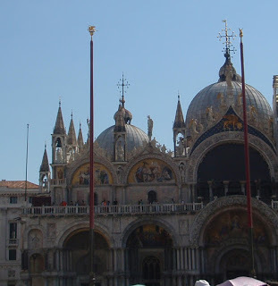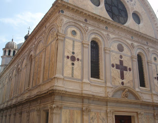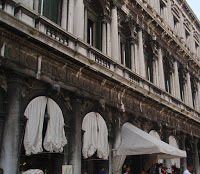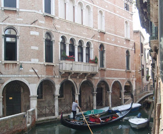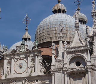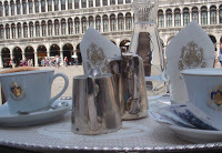 I had remembered a wonderful little church with walls of marble from years ago but didn't know where exactly it lay, apart from being beside a canal which are plentiful in Venice! So we started wandering through the back streets and narrow alleys, over countless bridges, always going forwards where possible. Suddenly, around one corner there it stood on front of us, the Santa Maria dei Miracoli, dating from 1481 to 1489. We did get lost in the end but finally found our way back to San Marco to enjoy a special anniversary treat of coffee at the famous 18th century Florians in the square while listening to the orchestra.