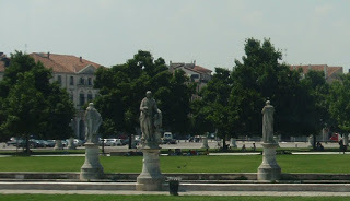I already knew that Padua had one of the oldest universities in the world, founded in 1222, but didn’t realise it came second only to Bologna, another Italian university. Once home to Galileo, Copernicus and Dante, the town has retained many of its medieval areas. It also has one of the biggest squares in Europe which began as a Roman theatre and was reshaped into its present layout in 1775. It was so hot the day of our visit that I missed having a walk around it to view the many elegant statues encircling the area – I had to make do with a quick photo as we passed.