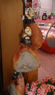 Overlooking the Piazza is the impressive twelfth century Cathedral of San Giorgio with its interesting mixture of Gothic and Romanesque styles. There are also several palaces and museums to visit which warrant far more time than we had available. As we wandered through the town, it became increasingly obvious that everyone cycles here and you do have to be constantly aware of the bikes once in the narrower cobbled streets, away from the wide main streets. I couldn't resist a photo of one of the ham shops as we passed by.