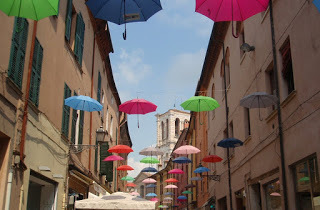 It was worth our walk in the heat as we were taken through the famous Jewish section where one of the unique little quirks of Ferrara met our eyes. Stretching the whole way ahead, colourful umbrellas seemingly hung from the sky between the buildings on either side and were quite a sight! They were obviously suspended by wire or similar and when we asked about them we were told: “they hang there so that tourists can talk about them and people will want to visit Ferrara.” It’s certainly the best advertising I’ve ever seen and I’m now doing my bit to bring attention to this interesting medieval town.