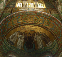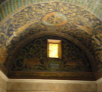 MausoleumOur walk took us first to the Basilica of San Vitale and the most interesting mausoleum in the grounds behind, which is the burial place of Galla Placidia, daughter of a Roman emperor. The mausoleum only holds so many people at once and we managed to visit it first. What an amazing, atmospheric building inside. It has some of the best preserved and oldest Roman art mosaics in the world, dating from the year 500, and it was truly awesome, in its correct meaning. I could understand why it was one of our guide’s favourite venues and I just wanted to stand and absorb it in silence. Fortunately, they allowed photographs without flash so I managed a few.