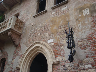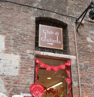 It is through the courtyard, towards the back of the house, where we also found the statue of Juliet. By late morning in the middle of June, crowded is an understatement! So many groups of tourists, all trying to reach the statue and photographing the balcony - with an occasional female even leaning from it. It is said that you should touch Juliet’s right breast for luck. I contented myself with managing to sneak a quick photo in between the crowds! Next to the house is Juliet’s Club where they make souvenirs and answer the many letters posted on the wall through the archway. If you want to know more about it, the lovely romantic film, Letters to Juliet, is well worth watching.