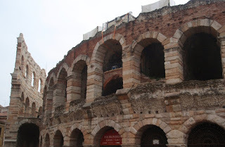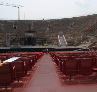 On the Via Arche Scaligere, there is an authentic 12th century house that seems to have belonged to Romeo’s family but we didn’t get the chance to see it and some of the rooms are incorporated into a nearby restaurant. We wandered on through the heat until we reached the impressive Roman amphitheatre, one of the highlights of my visit as it is one of the oldest in in Italy and home to the famous Verona opera. Once through the gates, we were able to sit on the stone steps and enjoy the ambience while watching the open-air stage being set for that evening’s production. Going by the parts of Egyptian-style set we saw, it must have been Verdi’s Aida!
