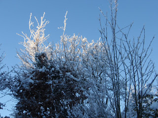We've had our first fall of snow the last couple of days and today the sun is shining, making it a lovely winter scene here, although I took the above photo last year. The birds are fighting over the hanging containers of food and the clever little robin is waiting beneath one of them for the crumbs dislodged by the longer beaked birds. All very distracting while trying to write!