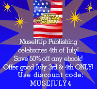 Thought I'd mention the MuseItUp Publishing half price sale on their ebooks for today and tomorrow only, 3rd and 4th July, to honour the American 4th of July holiday. You can buy any of their ebooks here, if so inclined - don't forget the code: MUSEJULY4. They also use PayPal.
