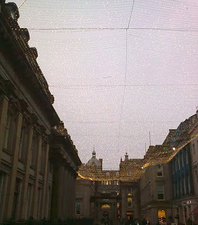 I hope the photo gives some idea of the glorious canopy of star-like lights stretched across some of our city's most gracious architecture - had to keep looking down to avoid tripping over anything. Lovely day out, and I even wrote on the train both ways. Must do it again soon!