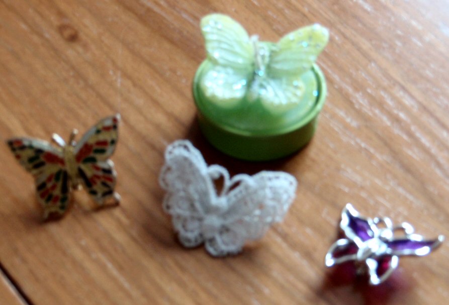 Some of my friends and family know that I like butterflies and they have often bought me one as a gift for birthday or Christmas - not a real one I hasten to say! Some of the lovely items that contained a butterfly include: a brooch, a candle, painted on a shawl, embellishment on a jewellery stand, a picture on a notebook. These are only the things I can think of immediately. Many of my gorgeous cards contain a butterfly, or two.