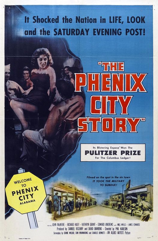In the late 1940s, the chiefs at Monogram, wanting to make their brand appear more artistic to film goers and newspaper critics, began putting out bigger budget films under their new name Allied Artists. Karlson (who made AA's first “important” picture, Black Gold) was asked to begin making better (more expensive) movies. The Karlson-directed AA crime films released in the 1950s where far from being big-budget A films, but they were a long way from the 4 or 5 day movie shoots with no budget cheapies Karlson cut his teeth with. One of Karlson's best was one released in 1955, The Phenix City Story. True, Karlson churned out five movies that year for Allied Artists and Columbia Pictures, but this one stood out for its gritty realism due to the film being shot in the Alabama town during the same time the actual trial for the real-life killing was taking place.