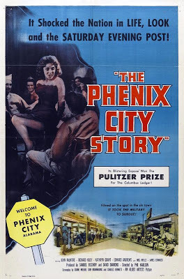 The highly fictionalized story was based on fact. In 1954, in a series of events that no doubt reminded Karlson of his youth in Al Capone-era Chicago, became famous when reporters dubbed the Alabama town “Sin City.” Drugs were sold openly, prostitutes solicited johns on the street corners, and sleazy clubs offered gambling. Not seen by the citizens and army men from Fort Benning that visited the town for pleasure were other even more sleazy rackets including a safe-cracking school and a black-market baby ring. It wasn't until the state's attorney general elect – who campaigned with the promise that he would clean up the city --was murdered in 1954 did the citizens demand action against the criminal element. After the killing, the national guard was sent in and the major crime bosses fled. This was exactly the type of story that B-thriller semidocumentaries were made from. And it was -- the very next year.