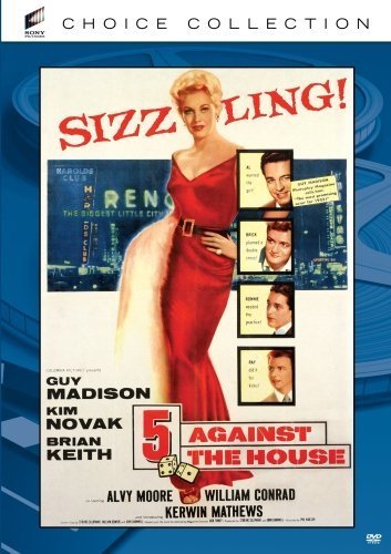By Lee PfeifferSony has released the 1955 crime drama 5 Against the House as a burn-to-order DVD. The little-remembered film is interesting on a number of levels and boasts an impressive, eclectic cast. The low-budget flick depicts four young ex-G.I.s who fought in Korea who return to the States and enroll in college. Al (Guy Madison) is a straight-as-an-arrow type who is engaged to sultry nightclub singer Kay (Kim Novak). Ronnie (Kerwin Matthews) is a brainy upstart with delusions of grandeur and a superiority complex. Roy (Alvy Moore) is an affable joker who is very much a follower, not a leader. Brick (Brian Keith) is the most troubled of the group. He bares psychological problems from his combat experience and has a hair-trigger temper. The guys' only vices are taking an occasional trip to Reno, Nevada and engaging in some minor gambling and womanizing. However, Ronnie concocts an audacious plan to prove he can outwit the authorities and rob a casino.