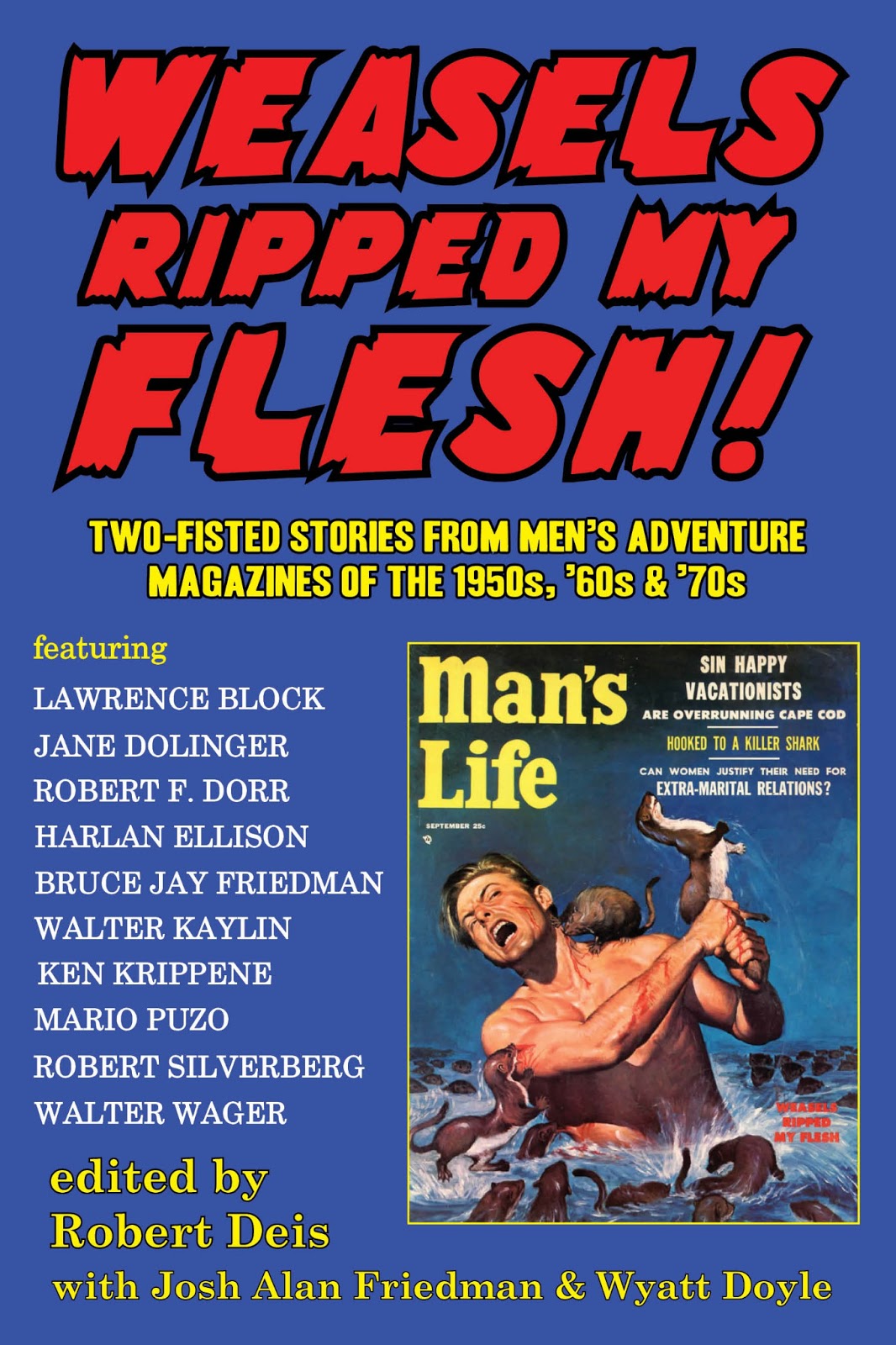 Don’t get me wrong — cinemania will always be my favorite mania… but I do understand and appreciate other kinds of madness and passion. The compulsion to collect vinyl, for example (records, I mean, not pants) or for following the Grateful Dead, or for owning first editions, or for reading and even owning original copies of the men’s magazines that proliferated on America’s newsstands after World War II. I know, you hear “men’s magazines” and you immediately think Playboy or Gent or Hustler but I’m not talking about skin mags. No, I mean men’s adventuremags, monthly collections of pulp fiction, he-man tales of derring-do (did you even know it was spelled that way?! Five hundred years later and we’re still dancing to Chaucer’s tune.) that were popular with the generation of American males who had come home from conflicts in World War II and Korea with an unquenchable taste for two-fisted tales of bravery, resolve, vengeance, lust, greed, cunning and every other quality Ava Gardner looked for in a husband. Before porn wormed its way out of the back room and onto the high shelf, before Hugh Hefner arranged the marriage of Joe Sixpack and Rosie Palmer, before they became obsessed with their manscapes and their electronics and their microbrews and how to grill the perfect steak, American men thrilled to the ephemeral offerings of such established and fly-by-night publications as Man’s Life, Man’s Look, Real Men, For Men Only, Sir!, Stag, Battle Cry, Argosy, Adventure, True Adventures, Adventure Life, Escape to Adventure, Saga, Rage, Gusto and many more. (Experts in this field tend to disagree but one estimate of the total number of men’s adventure magazines that came and went between 1950 and 1980 runs to 150.) Running low on word count (all the better to read in the donnicker) but high on testosterone, these tales ranged from true war chronicles of courage behind enemy lines (Robert F. Dorr’s “Bayonet Killer of Heartbreak Ridge”) to EC Comics-style cautionary tales of the awful wages of sin (Harlan Ellison’s “Death Climb”), to exposes purporting to take the reader into the throbbing demimonde of casual sex (Gilbert Nash’s “Beat Girls: Worshippers of Zen and Sin”) to gonzo revenge-of-nature stories about humans pitted against a proactive and predatory nature (“Weasels Ripped My Flesh,” the classic Man’s Life story penned by the pseudonymous “Mike Kamens,” whose identity was never revealed and remains to this day… unknown.) If your fists aren’t curling just by reading this, you should just stop reading now.If, however, this kind of thing seems right up your alley, you’ll probably want to get on eBay and start bidding on remaining issues of these long-MIA magazines. Assembling a small collection would probably only run you a few hundred or thousand dollars… orrrrrr you could just pop down a double-sawbuck for Weasels Ripped My Flesh! Two-Fisted Stories from Men’s Adventure Magazines of the 1950s, ’60s, & ’70s. Put out by the California-based independent publisher New Texture, this concordance collects two dozen of the stories that first appeared between the lushly-illustrated covers of assorted men’s adventure magazines, among them Walter Kaylin’s “Bar Room Girl Who Touched Off a Tribal War” (first published in Male Main June 1966), Bruce Jay Friedman’s “Eat Her … Bones and All” ( Gent , December 1954), Robert Silverberg’s “Trapped by the Mau Mau Terror” ( Exotic Adventures , 1959), Vic Pate’s “Chewed to Bits by Giant Turtles” (Man’s Life, May 1957), Jim McDonald’s “Grisly Rites of Hitler’s Monster Flesh Stripper” ( Man’s Story , March 1965), Ken Krippene’s “I Married a Jungle Savage” (Sir!, November 1962), Joanne Beardon’s “I Went to a Lesbian Party” (All Man, May 1964) and, of course, the title track, Weasels Ripped My Flesh ( Man’s Life , September 1956). If the title sounds oddly familiar, it may be because Frank Zappa cadged it for the title of a 1970 Mothers of Invention album, and its title track, making it one of those classic titles that has been referenced more often than actually read. Unavailable for years, the story leads this collection, like a dogface taking point, like Korean war hero Donn F. Porter, “The Bayonet Killer of Heartbreak Ridge,” whose story is also told here for the first time since it was published in Man’s Magazine in October 1964.
