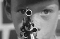 Billy Mumy with loaded gun.5. Bang! You're Dead - Hitchcock directed this wonderfully tense episode about a young boy (Billy Mumy) who mistakes a real gun for a toy pistol and spends the day playing with it. The worst part: the gun is loaded. Mumy's success as Will Robinson on Lost in Space has obscured his finest TV work, as in this episode and the "It's a Good Life" episode of The Twilight Zone.Honorable Mentions: One More Mile to Go (a man with a corpse in his car trunk) and Victim Four (a Paul Henreid-directed episode about a woman whose bad headaches are really bad). It's interesting to note that both Alfred Hitchcock Presents and The Twilight Zone featured adaptations of Ambrose Bierce's An Occurrence at Owl Creek Bridge. However, The Twilight Zone episode was actually a short French feature filmed two years before its broadcast on Twilight Zone.Posted by Rick29 at 10:31 AM 12 comments