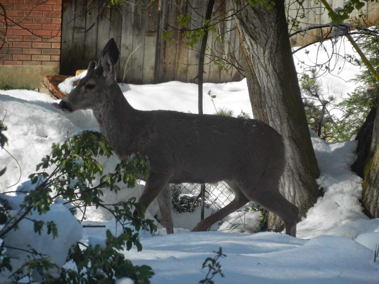 Then this morning things got even better. I found a visitor in my backyard. A small buck mule deer—velvet covered antlers between his ears—laying in a deciduous alcove. The snow like ground cover around his bed. It really is the small stuff.