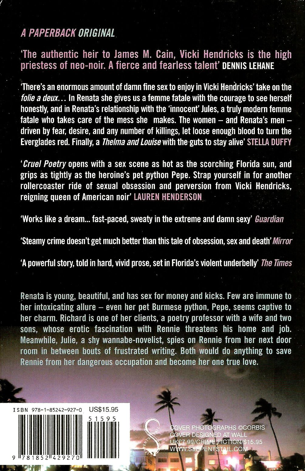 Vicki Hendricks’ earlier novels excelled at capturing single protagonists caught in insatiable and increasingly tightening vices. The protagonists of Miami Purity , Iguana Love , Voluntary Madness and Sky Blues all wanted a euphoric kick to jumpstart their dull lives—and they got it tenfold. With open arms, they welcomed sex, thrills, danger, and murder. Hendricks’ fifth novel, the Edgar-nominated Cruel Poetry, stands amongst her most sophisticated and complex works to date. Hendricks has expanded her view to encompass three narrators whose lives, desires, and crimes are intertwined into a thick knot of noir that can’t be undone.