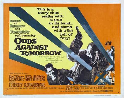 Odds Against Tomorrow stars Harry Belafonte as Johnny Ingram, a nightclub singer with a gambling problem. To pay off his debts, Ingram agrees to rob a bank with an old ex-cop named Dave Burke (Ed Begley). Dave also enlists a third man for the job, a racist hood by the name of Earle Slater (Robert Ryan). Earle doesn’t like Johnny because he’s black; Johnny doesn’t like Earle because he’s a bigot. It’s pretty much all Dave can do to keep these two from killing each other before they knock over the bank.Most American films about race from the fifties and sixties are pretty bad. They have a certain stiffness, a do-gooder liberal atmosphere which is mostly geared toward glorifying the enlightenment of white characters. Perhaps these films served a purpose in their time, but they make for bad entertainment and worse art. (One could say the same thing, one suspects, about recent Hollywood movies about race…)Odds Against Tomorrow is an extremely rare exception to this case. The movie was produced by Belafonte through his production company, but he demands none of the “noble black hero” treatment that marred much of Sidney Poitier’s work from the same era. Instead, Johnny Ingram is a perfect film noir protagonist. He’s likable and relatable, but he’s deeply flawed. His flaws will be his undoing. Belafonte’s charismatic in the role, giving Johnny a quick, shallow charm that meshes nicely with Robert Ryan’s fiery, bigoted Earle. Ryan was a natural choice for this role, of course, given both his real world interest in the civil rights movement and his established screen persona as film noir’s King of the Nutjobs. He makes Earle a tower of seething resentment and rage.The film was written by the blacklisted Abraham Polonsky, and it bears all of his usual intelligence and subtly. What is unique about Odds Against Tomorrow as a “race drama” is that the characters are allowed to have individual psychoses which have nothing to do with race. Johnny is a womanizing gambler who still loves his ex-wife but resents her for disapproving of his lifestyle. Earle is emotionally knotted up. He’s a married man who has a brief affair with his next door neighbor (Gloria Grahame in an exceptional, touching performance) almost out of sheer ennui. The conflict between the two men is an outgrowth of both their characters, not a plot point.All of this is handled with Wise’s usual skill and efficiency. He never beats a point too hard, never goes for a preachy moment. He keeps things moving at a quick pace, but lets characters unfold naturally at the same time. For example, Ryan’s seduction of Graham has the pressure of a suspense scene, while the bank robbery is tense because of the evolving relationship of the characters.Wise made other interesting noirs, but Born To Kill, The Set-Up, and Odds Against Tomorrow are an excellent place to begin reassessing his work.