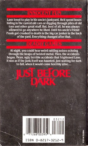 From Ben Bouden GRAVETAPPINGPosted: 17 Apr 2014 02:16 PM PDTJust Before Dark is the fifth (of five) horror novels written by Bill Crider and published as by Jack MacLane. It was published by Zebra in November 1990, and the cover art is terrific in a disturbing if tongue-in-cheek sort of way. It is dark—a purple smudge for sky—and features a cold metallic junkyard piled high. It reminds me of the first thirty minutes of the film “Wall-E” with the added appeal of skeletons strewn throughout. The artist is uncredited.