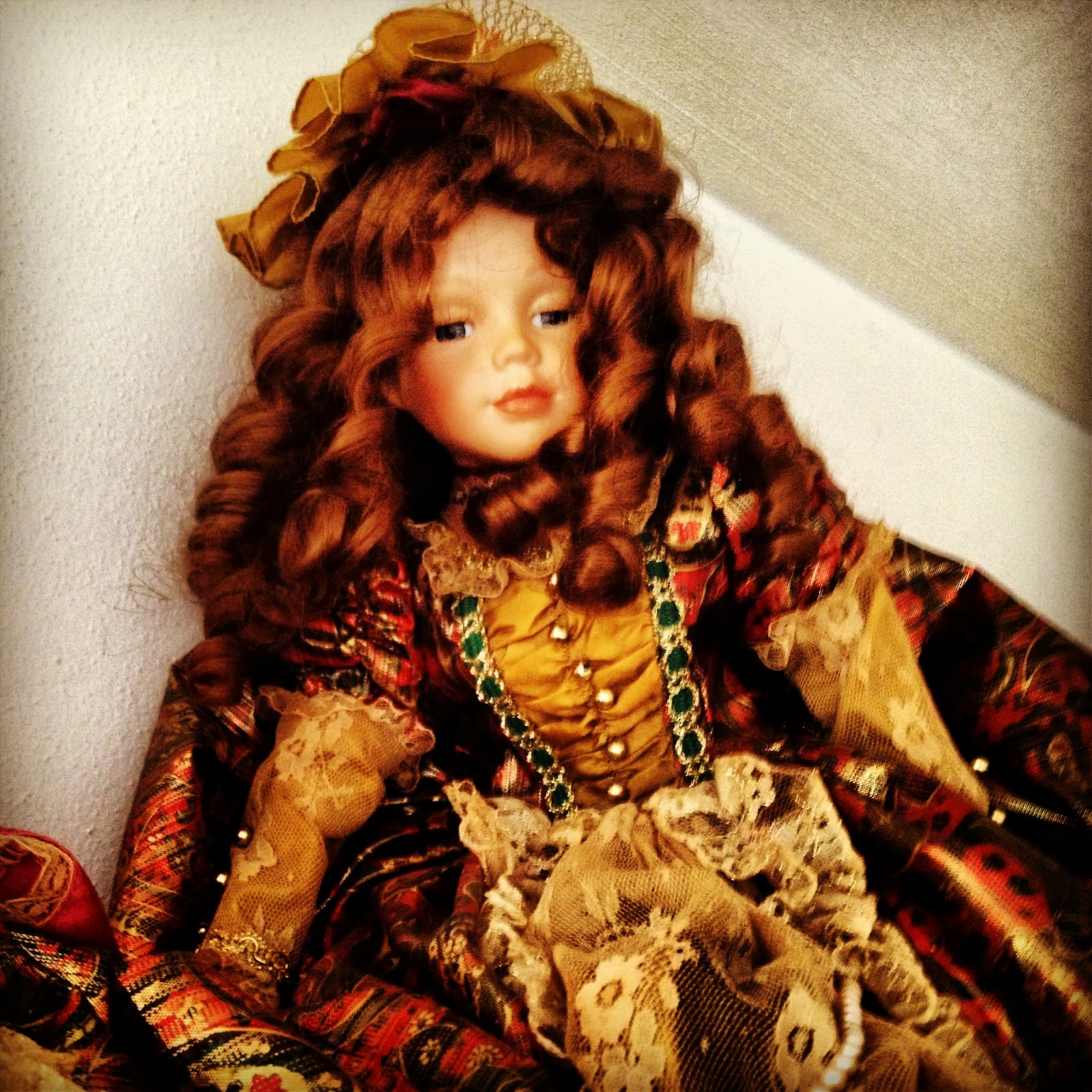 Here is a photo of the creepy porcelain doll that looks down at me every time I change my clothes or sleep in my mother's guest room.
