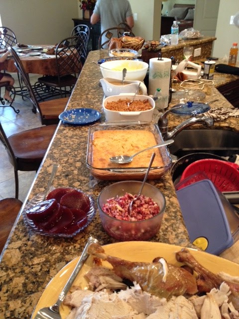 I had Thanksgiving at my Dad's house this year. It was a wonderful meal prepared by his fiance. She made a turkey that looked like something from a movie and there were enough side-dishes to feed an army. About 15 of us gathered to eat turkey, cornbread casserole, green bean casserole, cranberry sauce (blah), mashed potatoes with turkey gravy, raspberry pie, warm rolls with butter, Hershey Kiss peanut butter cookies, among more things I can't remember.Here is the spread:
