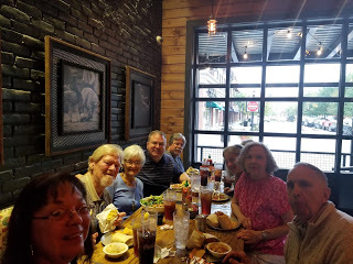 In the evening I read with Ginny Savage Ayers Writers Can Read at Empire Books in Huntington, and had dinner first with Reading series curators Eliot Parker and Carter Seaton along with people including Llewellyn and John McKernan, Cat Pleska, and Eddy Pendarvis (hidden by moi in the photo). She invited me to stay in her home overnight, and I got up at the crack of dawn and drove back up the road.