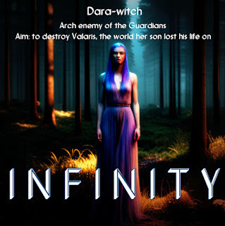 Infinity, the dara-witch, is the bane our characters have to deal with. She appears for the first time in the Great Forest of Valaris. In fact, the first LORE book is called THE INFINITY MANTLE because of her influence - the Infinity part is self-explanatory & the Mantle part refers to a secret organisation on Valaris. Does she send everyone on a chase!(Infinity is naked in the books but AI wouldn't deliver that for me, not even tastefully 🤪 )