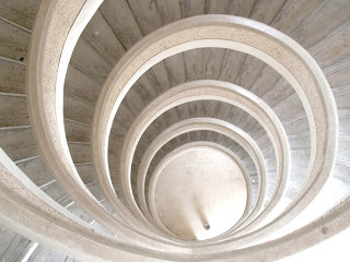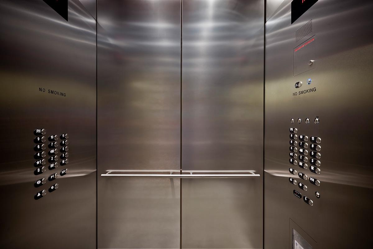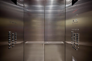 At an elevator, he punches in a code and the metal door whisks open. We enter into silence. The door closes.
