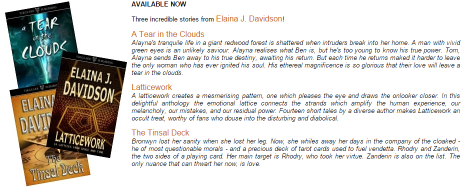 Friday 5 June is release day for The Tinsal Deck, Latticework and A Tear in the Clouds. Currently on pre-order from Tirrgear Publshing :)