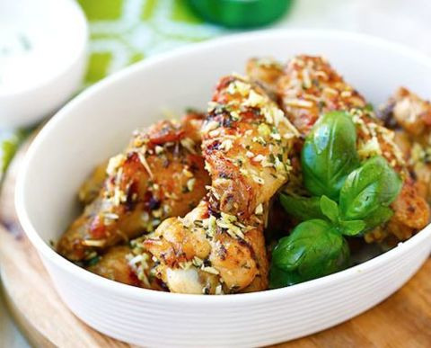 Ingredients: 12 chicken wings. ½ cup grated Parmesan cheese. 2 cloves garlic, minced. 2 tablespoons olive oil. 1 teaspoon dried oregano. ½ teaspoon paprika. Salt and pepper to taste.