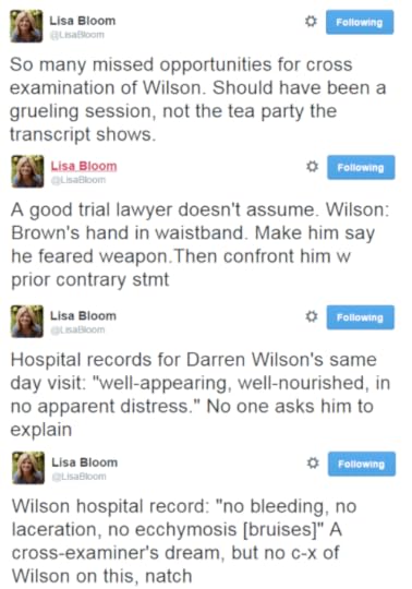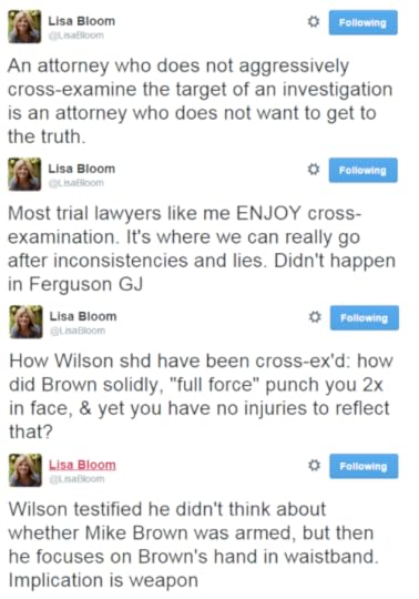 Lisa Bloom, (Gloria Allred’s daughter) is an attorney, author, CNN legal analyst, and founder of general-practice law firm The Bloom Firm. Let me just tell you it’s nice to see an actual lawyer reading McCulloch and his team for filth. These words aren’t more valuable because she’s a white woman, but it’s certainly heartening to see white allies publicly denouncing that miscarriage of justice.