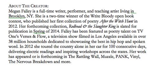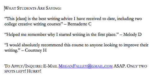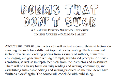 That being said, I am going to make some adjustments to “Poems That Don’t Suck" based on suggestions from students/what I noticed as an instructor, and teach the course again to a fresh batch of writers! Many of you have expressed interest. Maybe you are involved in a writing/poetry scene and know some writers who would benefit from an intensive writing and reading course. If you are interested or know someone who might be, please pass this along! Class will start Monday, August 19th and I’ll be accepting applications until August 5th. MeganFalley@gmail.com