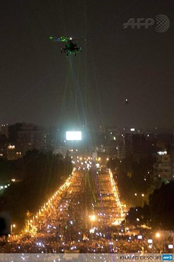 Twitter / AFP:"Egyptian protestors direct laser lights on a military helicopter flying over the presidential palace in Cairo."
