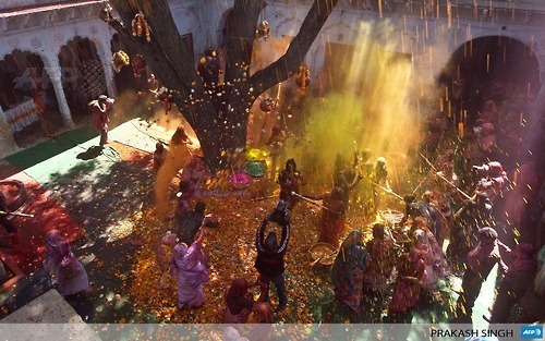 INDIA, VRINDAVAN: Indian widows celebrate Holi with water and gulal (coloured powder) in Vrindavan on March 14, 2014. Breaking centuries-old tradition, around 1,000 widows living in the holy city of Vrindavan celebrated the spring colour festival of Holi at Meera Sahabhagini Sadan in Vrindavan. In a symbolic gesture, the widows celebrated Holi with colours and gulal unlike the previous year where they only sprinkled flower petals over each other. As per Indian tradition, widows are...