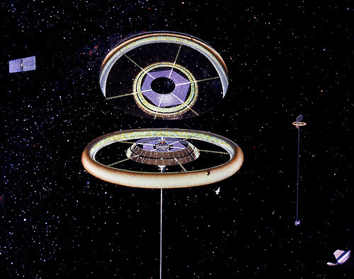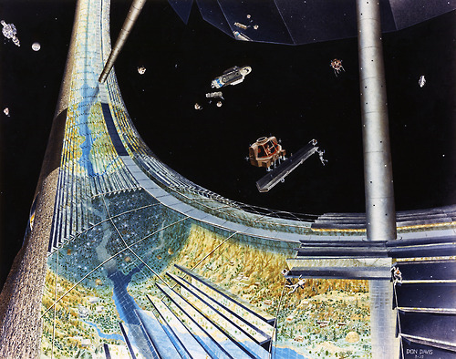 Designed at NASA in 1970 as part of the ongoingSpace Settlement program. Artwork by Don Davis.