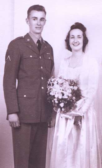 Written in the voice of the bride and based on a true story, Moments Before A Wedding was inspired by my mother, whose husband, Carl Robert Swanson, was killed in the Battle of the Bulge. They had been childhood sweethearts, and shared a love of music. Here is a photo of their wedding: