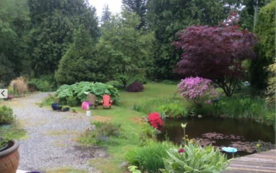 –Photos from 2019, one property in Roberts Creek. This peaceful landscape, habitat of birds, fish, frogs, insects, deer, which has grown and flourished over the past 26 years, is now threatened with suburbia: managers & owner of the 2 acre property behind this half acre, (Originally a 5 acre forest) are in process to change 2 by-laws so they can subdivide. The subdivision would double the density — with the possibility of 3 additional full-size houses (to a maximum of 32,000 square feet allowed) with the change of by-laws.