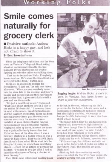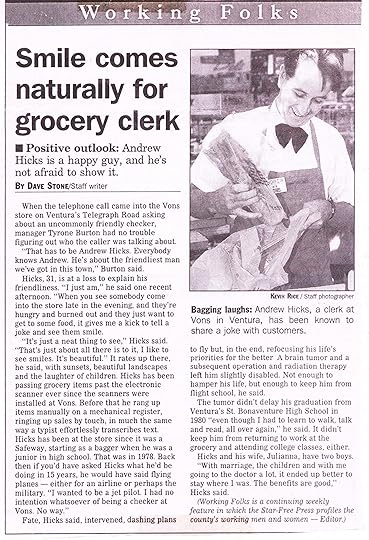 By the time Andrew was 31, his dreams, “to be a jet pilot” were replaced by his reality as a checker at Vons, the local grocery. In spite of his own sense of failure when comparing himself to his other brothers (one became a doctor; 3 became bankers), at VONS, Andrew was known for being the friendliest man in town.