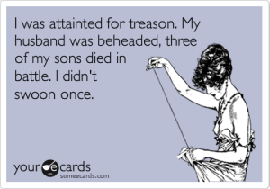 Elizabeth Wydeville – a commoner! – had the temerity to marry a king. And she is portrayed in all kinds of negative ways. Grasping; greedy; jealous; manipulative; spiteful… In one book. the Too Good to be True Heroine catches her mocking a fat servant (and that was before she married her king!) Now, I’m contractually obligated to hate the Wydevilles for the duration, but I’ve been give a day’s reprieve, so I’ll make the most of it. Edward IV was the one whose actions were dubious. He had no business (from the perspective that a king’s marriage was about more than personal choice, it was about politics, alliances and other stuff) marrying Elizabeth. A lifelong commitment might not have been his first consideration. So, what was Elizabeth supposed to do in that case? Say, “Oh, I’m far too lowly and humble to be your queen! Please, by all means, sleep with me for as long as you want, then walk away.” Or perhaps, “Oh, don’t worry about the wedding thing! I understand. Off you go. It’s been such fun!”