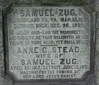 On December 26, 1889, Samuel Zug died leaving his holdings to his wife, Anne, who died on June 10th,1891. It has been reported wrongly that Mr. Zug died in 1896. My source for the correct date of Zug's death comes from his huge tombstone in Detroit's Elmwood Cemetery.