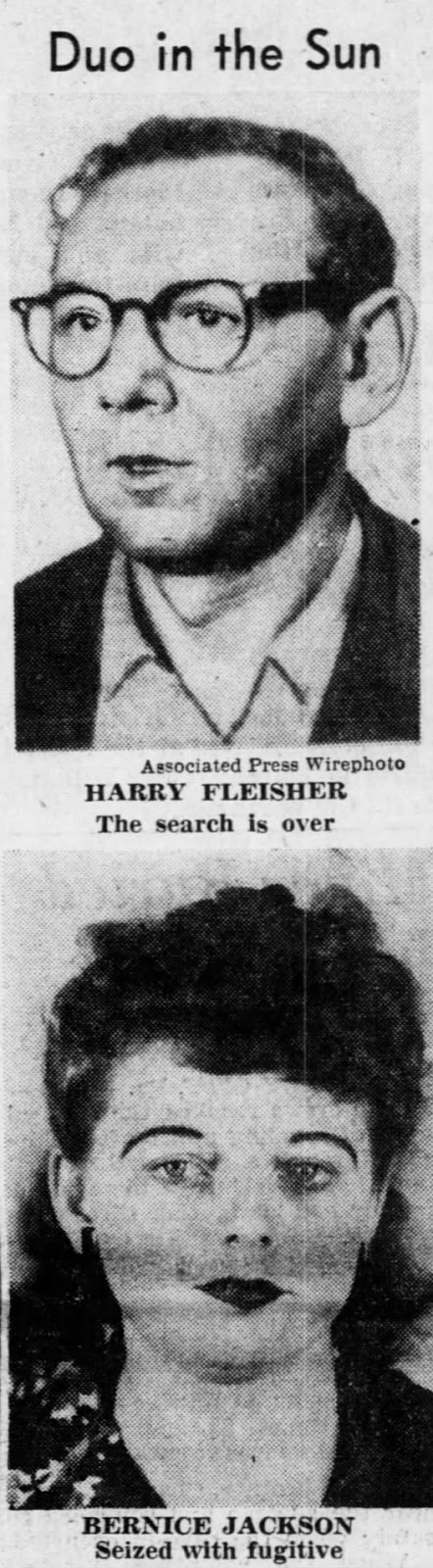 Fleisher dodged arrest for fifteen months. Acting on a phone tip, he was seized by FBI agents in Pompano Beach, Florida--thirty-five miles north of Miami. He and a woman companion Bernice Jackson were registered at a tourist court as Mr. and Mrs. Marvin Goldwyn of Toledo, Ohio. The couple left the cottage and drove to the beach in Fleisher's pickup truck. A squad of four agents dressed in sports shirts and slacks slowly closed in on the couple sunning themselves on the beach. When the agents were noticed fifteen feet away, they rushed on Fleisher and held his face down in the sand while they handcuffed him. Miss Jackson stood quietly with her hands up in the air. When their cottage was searched, a submachine gun was found with 400 rounds of Colt ammunition. Fleisher had $1,200 cash in his possession. He was arrested on a Federal fugitive warrant, and Miss Jackson was jailed as a material witness.