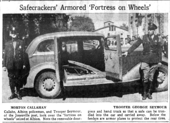 On May 11, 1936 at 2:30 a.m., night clerk Jack Kane at the Capital Hotel next door to the Isabell Seed Company in Jackson, Michigan, heard men struggling to load the company's 500 pound safe through the side doors of the Graham Paige sedan. The burglary was reported to the State Police, but troopers were too slow on the scene to make an arrest or give chase. Then on May 30th, a local Albion resident reported to state police that a suspicious Graham Paige sedan was being stored in a barn across from the junkyard in Albion.