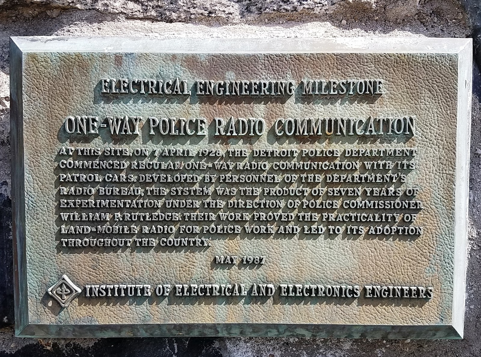 In 1987, the Institute of Electrical and Electronic Engineers honored the technical achievement of the Detroit Police Department with a plaque on the front of the now deserted Belle Isle precinct station, commemorating the electrical engineering milestone of dedicated police radio communications.
