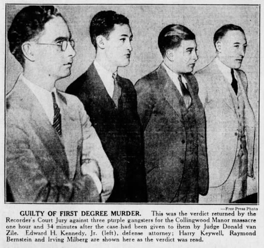Believing the Burnsteins were phasing out of the liquor business and going legit, Izzy Sutker, Hymie Paul, and Joe Lebowitz showed up at an improvised meeting they thought would make them rich men. Burnstein childhood friend Solomon Levine--and business partner of Izzy Sutker--was duped into driving Sutker and his wing men to the Collingwood Manor Apartments on September 16, 1931 to discuss the deal. But the Purples were harboring another grudge which they could not forgive. One of their men was murdered outside a Purple Gang protected gambling joint on their territory. Word on the street pointed the finger at Sutker as the trigger man.