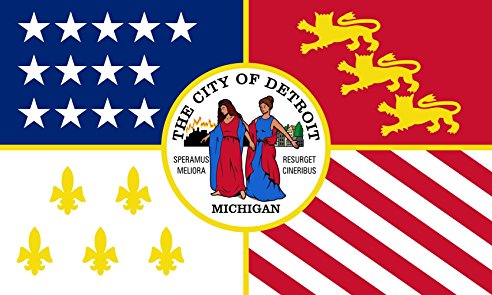 The second way Detroiters are reminded of the Great Fire is emblazoned on the city's official flag reflecting its early history. The flag's field is divided into quarters. One panel represents the city's French heritage with five golden fleurs-de-lis on a white background. One panel represents British rule with three golden lions on a red background. The other two panels represent the United States. One has thirteen stars on a blue background and the other has thirteen red and white stripes. The city's emblem and motto are centered on the flag. A woman weeps while another comforts her with the words of Father Richard, "We hope for better times. It will rise from the ashes." In our time, these words are prophetic.