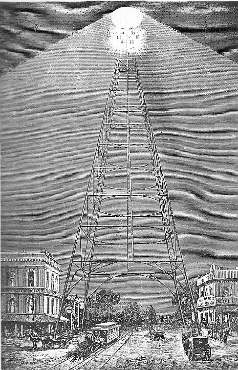 Large municipalities who could afford them invested in moonlight towers illuminatet large expanses like parks and public squares. Each tower was crowned with six carbon-arc lights giving off 200 times more illumination than the most powerful incandescent light bulbs.