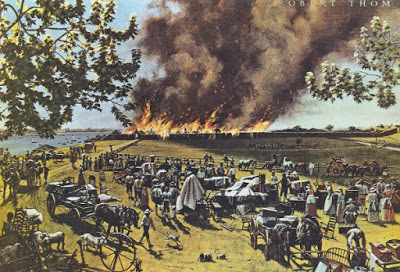 At about 9:00 am on June 11, 1805, the only fire-fighting equipment the city had were wooden buckets. Although no official cause for what history notes as the Great Fire was ever determined, it was widely believed that baker John Harvey carelessly tapped out some hot tobacco ash from his pipe catching some straw on fire. The fire quickly consumed his barn and spread embers throughout the city. It soon became evident that the fire brigade efforts were useless. The fire spread too quickly. Residents saved what they could and fled from the stockade. By afternoon, every home and building was razed except for the stone fort along the waterfront and some brick chimneys.