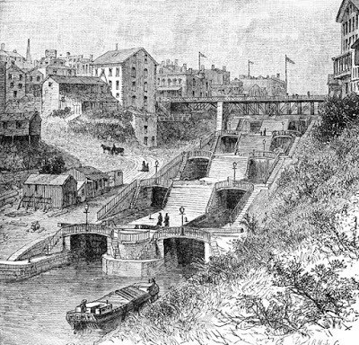 Untold numbers of Irish immigrants and draft animals provided most of the muscle power to dig out the canal. The excavated soil was piled on the north side and graded to form a towpath for horses to pull canal boats and barges along the route. Hundreds of migrant German masons were hired to build the stonework for thirty-four locks needed to raise the boats 565 feet--the elevation difference between the Hudson River and Lake Erie. Where the canal had to cross valleys and water barriers, the masons built eighteen aqueducts to carry the boats above them.