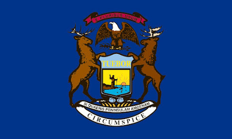 Michigan soon adopted its state seal and motto designed by Lewis Cass in 1835. The bald eagle symbolizes the United States, while the elk and the moose holding a shield symbolize Michigan, with the Latin word "Tuebor" meaning "I will defend." The state's motto is "Si Quaeris Peninsulam Amoenam Circumspice" (If you are looking for a beautiful peninsula, look around you), all on a field of dark blue.