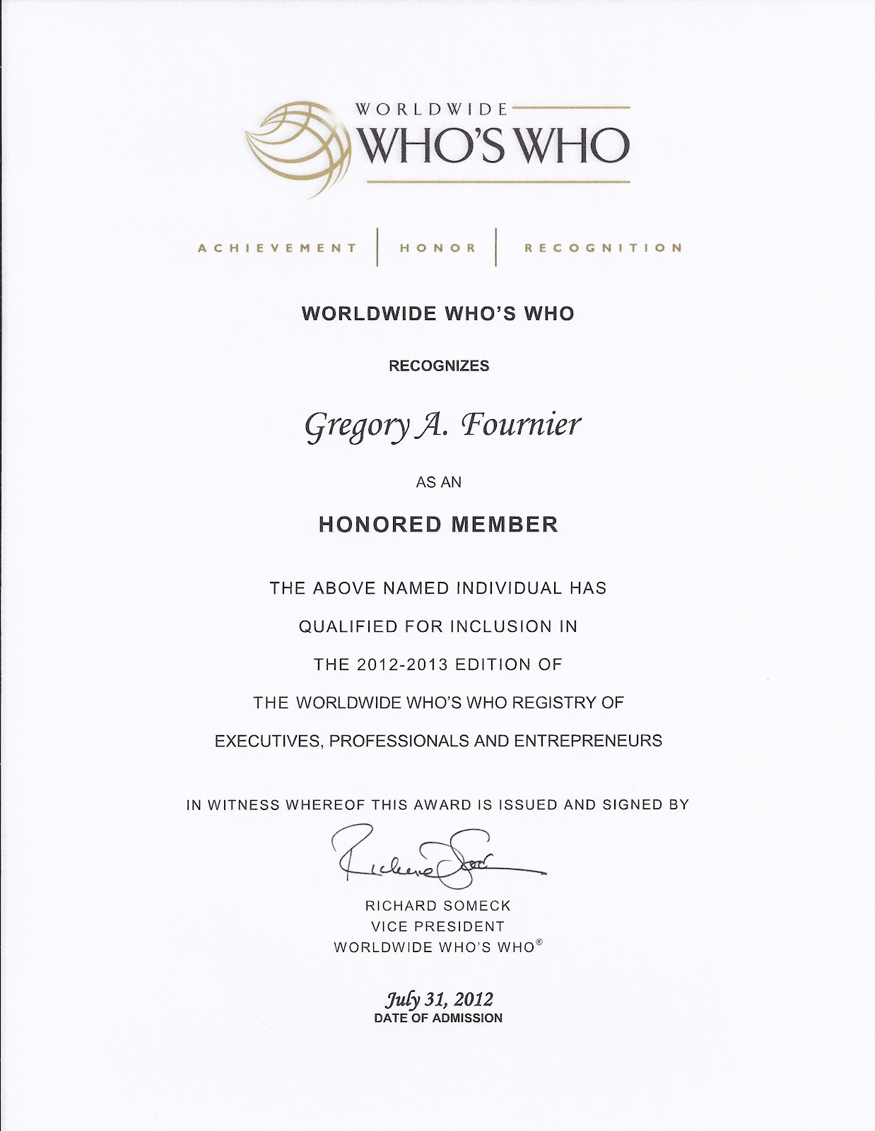 Zug Island Author, Gregory A. Fournier, Recognized by Worldwide Who's Who